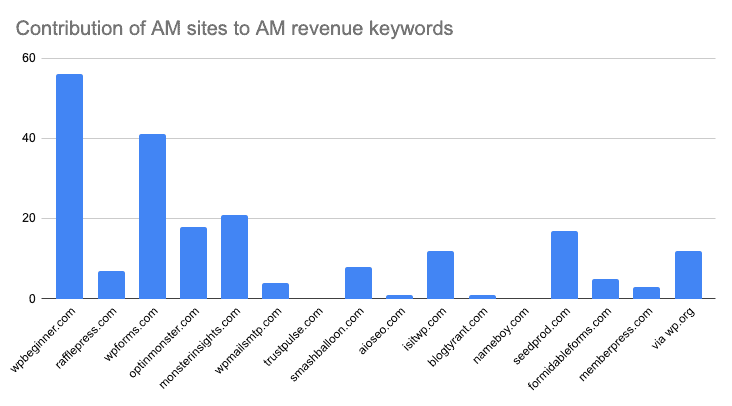 As you’d expect, WP Beginner makes the biggest contribution. It’s probably unreasonable to think every AM site can make a similar contribution, but the MonsterInsights/WP Forms performance is a good benchmark. There is still a lot of potential for AM to unlock cross-selling across its network.