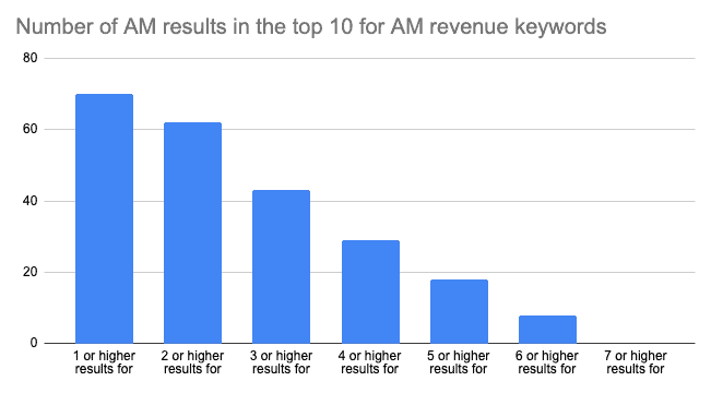 AM, though, can do better: for 89% of these keywords, they have at least 2 results in the top 10. That continues, all the way to 11% of results having six or more AM results in the top 10: