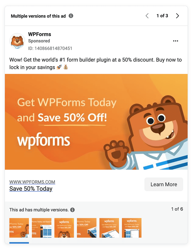 Facebook ads seem to be a newer experiment: the only ad WP Forms is running, for example, was created earlier this month. It’s what you’d expect, though; discount-driven ads with a bunch of variations: