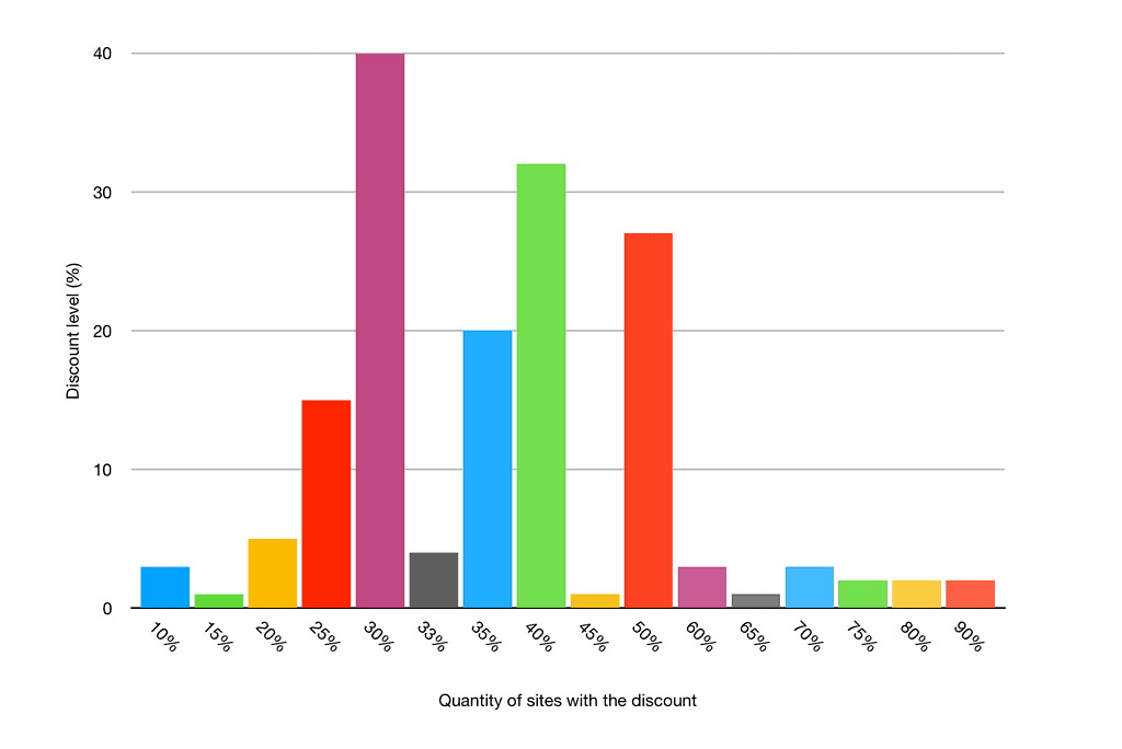 In previous years the focus on sales has been on the discount itself: “what is the best discount you can offer?” One of my favourite parts of last year’s post was the analysis of discount levels on offer from 167 products. The results showed us the discount levels seem pretty much picked at random, with spikes at 30%, 40%, and 50%, but also every 5% interval between 10% and 80% in there too: