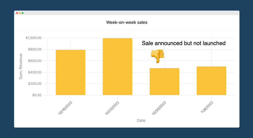 If you’ve already announced your sale but not started it, consider deleting the announcement. Telling customers “wait 5 days and you can save 30%” is a way to wreck your conversions in that interim period. A WordPress business that announced their sale at the start of November — but it doesn’t launch until Monday — kindly shared their revenue numbers with us: