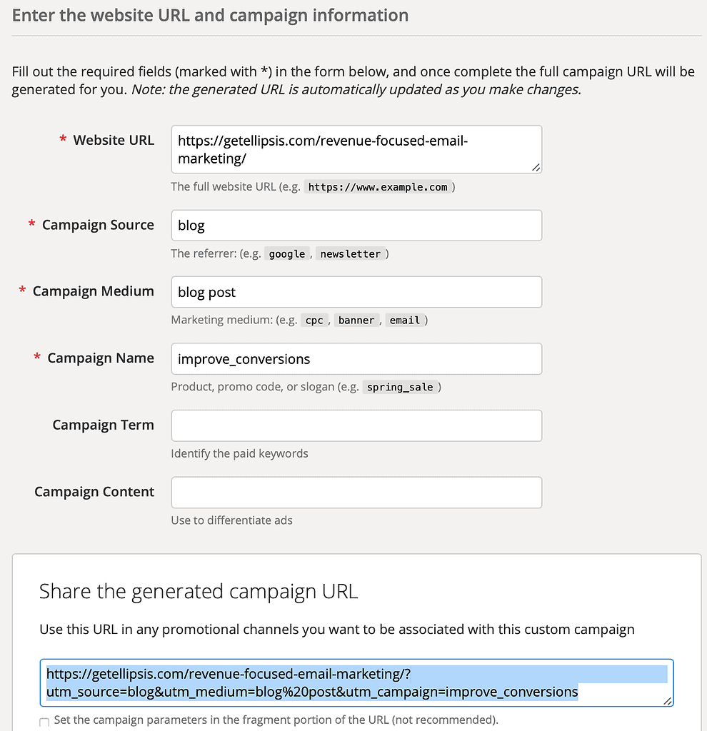 You can use Google’s free Campaign URL builder to add UTM codes to existing links, which you should use for your internal content. You just need to enter in the existing site URL, the campaign source, the medium, and the individual campaign name. It will look something like this: