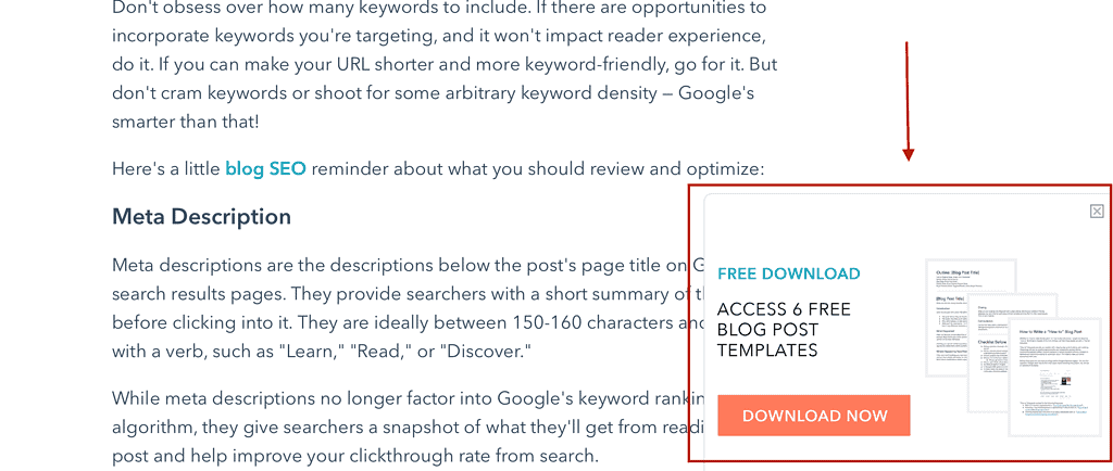This is a great example from HubSpot’s blog, featuring a floating CTA box for a lead magnet.