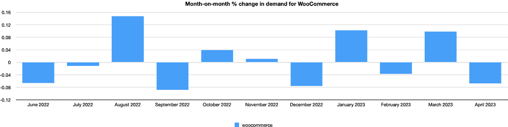 WooCommerce has had a much tougher year. After years of record pandemic-related growth, the increase in demand of only 1.0% is rough.