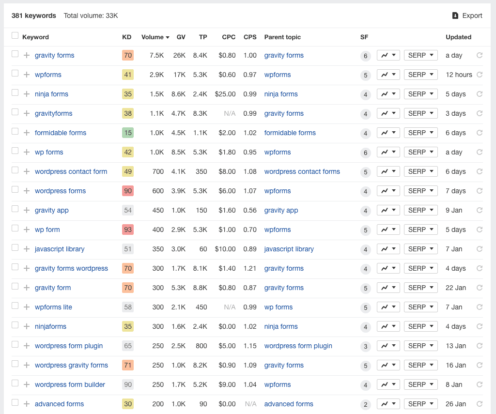 Manual keyword research often starts with a tool like Ahrefs: you enter a sensible “seed” keyword like “WordPress forms” and then start looking at the suggestions: